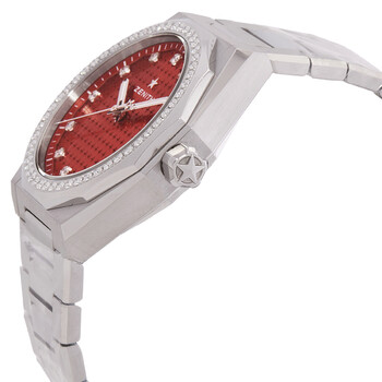 Silver-tone stainless steel case with a red silicone strap. Fixed silver-tone stainless steel bezel set with diamonds. Red dial with silver-tone hands and diamond hour markers. Dial Type: Analog. Luminescent hands. Date display at the 3 o'clock position. Zenith Calibre Elite 670 Automatic movement, based upon Zenith Elite 680, containing 27 Jewels, composed of 144 parts, bitting at 28800 vph, and has a power reserve of approximately 50 hours. Scratch resistant sapphire crystal. Transparent see through case back. Round case shape, case size: 36 mm. Folding clasp. Water resistant at 100 meters / 330 feet. Functions: date, hour, minute, second. Defy Series. Watch label: Swiss Made. Zenith Defy Automatic Diamond Red Dial Ladies Watch 16.9401.670/88.I001.
