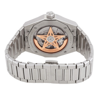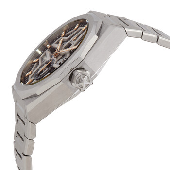Silver-tone stainless steel case and bracelet. Fixed silver-tone stainless steel bezel. Grey openworked dial with rose gold-tone hands and index hour markers. Minute markers around the outer rim. Dial Type: Analog. Luminescent hands and markers. One subdial displaying: one- 1/10th of a second. Zenith Calibre El Primero 3620 automatic movement. Scratch resistant sapphire crystal. Transparent case back. Octagon case shape, case size: 41 mm. Folding clasp. Water resistant at 100 meters / 330 feet. Functions: date, hour, minute, 1/10th of a second. Defy Skyline Series. Luxury watch style. Watch label: Swiss Made. Zenith Defy Skyline Automatic Men's Watch 03.9300.3620/80.I001.
