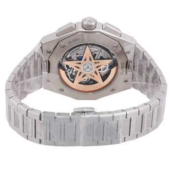 Silver-tone stainless steel case and bracelet. Fixed silver-tone stainless steel bezel. Slate grey dial with rose gold-tone hands and index hour markers. Minute markers around the outer rim. Dial Type: Analog. Luminescent hands and markers. Date display between 4 and 5 o'clock position. Chronograph - three sub-dials displaying: 60 second, 60 minute and small second. Zenith Calibre El Primero 3600 Automatic movement, containing 35 Jewels, composed of 311 parts, bitting at 36000 vph, and has a power reserve of approximately 60 hours. Scratch resistant sapphire crystal. Transparent see through case back. Octagonal case shape, case size: 42 mm. Folding clasp. Water resistant at 100 meters / 330 feet. Functions: chronograph, column wheel, date, hour, minute, small second, chronometer. Defy Series. Luxury watch style. Watch label: Swiss Made. Zenith Defy Skyline Chronograph Automatic Men's Watch 03.9500.3600/02.I001.