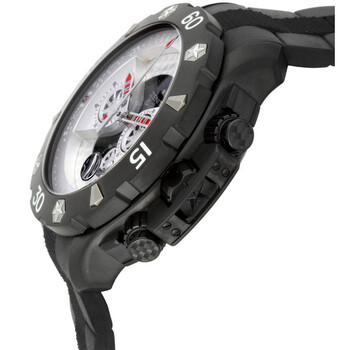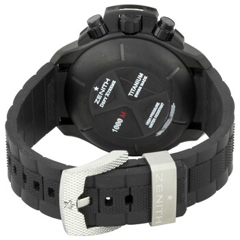 Black titanium case with a black rubber strap. Unidirectional rotating black titanium bezel. Silver dial with luminous red hands. Magnified date display between the 4 and 5 o'clock position. Chronograph - three sub-dials displaying: 60 seconds, 30 minutes and 12 hours. Automatic movement. Scratch resistant sapphire crystal. Screw down protected crown with carbon fiber inserts. Black titanium screw down case back with guilloche pattern. Case diameter: 46.5 mm. Case thickness: 17.0 mm. Tang clasp. Water resistant at 1000 meters / 3300 feet. Zenith Defy Xtreme Chronograph Men's Watch 96.0525.4000/21.R642.