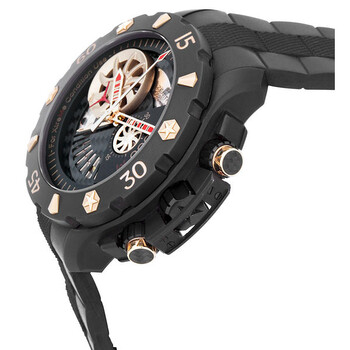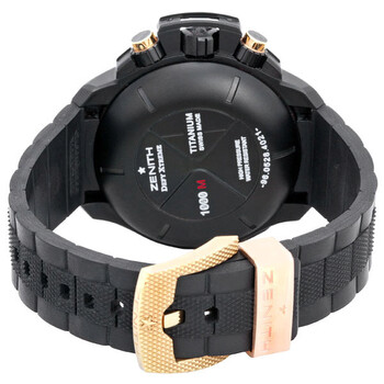 Black titanium and brushed 18k rose gold case with a black rubber bracelet. Black titanium with rose gold screw heads & cone-s bezel. Black/carbon fiber skeletonized dial with gold-tone hands and index hour markers. Minute markers around the outer rim. Power reserve sub-dial. Automatic chronograph with harmonic plate movement. Scratch resistant sapphire crystal. Black titanium screw in crown. Black titanium screw-in back with guilloche pattern case back. Case diameter: 46.5 mm. Case thickness: 17.0 mm. Tripe folding buckle clasp. Water resistant at 1000 meters (3330 feet). Functions: hours, minutes, small seconds, power reserve, chronograph, helium escape valve. Additional Info: helium valve at 10 o'clock. 30-minute counter at 3 o'clock. 55-hour power reserve indicator. Zenith Defy Xtreme Open El Primero Men's Wristwatch 960528402121R642.