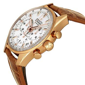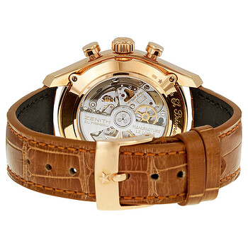 18kt rose gold case with a brown alligator leather strap with protective rubber backing. Fixed 18kt rose gold bezel. Mother of pearl dial with luminous hands and index hour markers. Minute markings. Tachymeter scale appears around the outer rim. Dial Type: Analog. Luminescent hands and markers. Date display between 4 and 5 o'clock position. Chronograph - three sub-dials displaying: 60 second, 30 minute and 12 hour. Automatic movement with 50 hour power reserve. Scratch resistant sapphire crystal. Pull / push crown. Transparent case back. Case diameter: 38 mm. Case thickness: 12.45 mm. Round case shape. Tang clasp. Water resistant at 30 meters / 100 feet. Functions: chronograph, date, hour, minute, second. Luxury watch style. Watch label: Swiss Made. Zenith El Primero 36 000 VpH Mother of Pearl Dial 18kt Rose Gold Brown Leather Unisex Watch 18215040082C709.