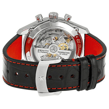 Stainless steel case with a black (alligator) leather strap with red backing. Fixed stainless steel bezel. Black dial with luminous silver-tone hands and index hour markers. Minute markers. Tachymeter around the outer rim. Dial Type: Analog. Luminescent hands and markers. Date display at the 6 o'clock position. Chronograph - three sub-dials displaying: 60 second, 30 minute and 12 hour. Zenith calibre El Primero 400B automatic movement, based upon Zenith El Primero 400, containing 31 Jewels, composed of 328 parts, bitting at 36000 vph, and has a power reserve of approximately 50 hours. Anti-reflective scratch resistant sapphire crystal. Pull / push crown. Transparent case back. Round case shape. Case size: 42 mm. Case thickness: 11.75 mm. Band width: 20.3 mm. Band length: 8 inches. Tang clasp. Water resistant at 100 meters / 330 feet. Functions: chronograph, tachymeter, date, hour, minute, second. Additional Info: limited edition of 500 pieces. El Primero 36000 Vph Series. Casual watch style. Watch label: Swiss Made. Item Variations: 03 2043 400/25 C703, 03-2043-400/25-C703, 03/2043/400/25/C703, 032043400/25C703. Zenith El Primero 36000 VPH Black Dial Black Leather Men's Watch 03.2043.400/25.C703.