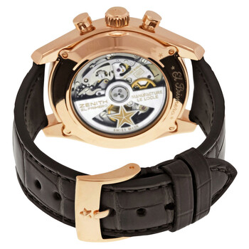 18kt rose gold case with a brown leather strap (rubber back). Fixed 18kt rose gold bezel. Grey dial with rose gold-tone hands and index hour markers. Minute markers. Tachymeter markings around the outer rim. Dial Type: Analog. Luminescent hands and markers. Date display between the 4 and 5 o'clock positions. Chronograph - three sub-dials displaying: 60 second, 30 minute and 12 hour. Zenith calibre El Primero 400 B automatic movement with a 50-hour power reserve. Anti-reflective scratch resistant sapphire crystal. Screw down crown. Transparent case back. Case size: 38 mm. Round case shape. Tang clasp. Water resistant at 30 meters / 100 feet. Functions: chronograph, date, hour, minute, second, tachymeter. Luxury watch style. Watch label: Swiss Made. Item Variations: 18 2150 400/21 C709, 18-2150-400/21-C709, 18/2150/400/21/C709, 182150400/21C709. Zenith El Primero Automatic Chronograph Men's Watch 18.2150.400/21.C709.