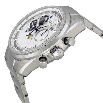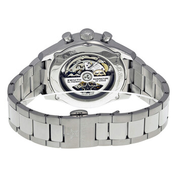 Stainless steel case with a stainless steel bracelet. Fixed stainless steel bezel. Silver dial with luminous silver-tone hands and index hour markers. Minute markers. Tachymeter around the outer rim. Dial Type: Analog. Luminescent hands and markers. Date display at the 2 o'clock position. Two sub-dials displaying: 30 minute and day/night indicator. Zenith calibre El Primero 4047 automatic movement with a 50-hour power reserve. Anti-eflective scratch resistant sapphire crystal. Screw down crown. Transparent sapphire glass case back. Case size: 45 mm. Case thickness: 15.60 mm. Round case shape. Band width: 20.3 mm. Band length: 8 inches. Triple fold over clasp. Water resistant at 50 meters / 165 feet. Functions: chronograph, date, hour, minute, second, tachymeter, day/night indicator. Luxury watch style. Watch label: Swiss Made. Zenith El Primero Automatic Men's Watch 03.2160.4047/01.M2160.