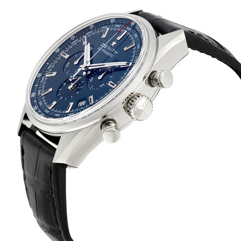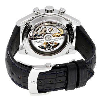 Stainless steel case with a blue leather strap. Fixed stainless steel bezel. Blue dial with luminous silver-tone hands and index hour markers. Minute markers. 1/100th markers. Tachymeter markings around the outer rim. Dial Type: Analog. Luminescent hands and markers. Date display between the 4 and 5 o'clock positions. Day of the week display at the 10 o'clock position. Month display at the 2 o'clock position. Chronograph - three sub-dials displaying: 60 second, 30 minute and 12 hour. Automatic movement with a 50-hour power reserve. Scratch resistant sapphire crystal. Screw down crown. Transparent case back. Case diameter: 42 mm. Case thickness: 12.75 mm. Round case shape. Strap width: 21 mm. Tang clasp. Water resistant at 50 meters / 165 feet. Functions: chronograph, date, day of the week, month, hour, minute, second, moonphase. Additional Info: limited edition of 1975 pieces. Luxury watch style. Watch label: Swiss Made. Item Variations: 03 2097 410/51 C700, 03-2097-410/51-C700, 03/2097/410/51/C700, 032097410/51C700. Zenith El Primero Automatic Moonphase Blue Dial Blue Leather Men's Watch 03.2097.410/51.C700.