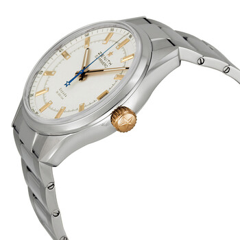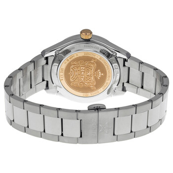 Stainless steel case with a stainless steel bracelet. Fixed stainless steel bezel. White dial with luminous rose gold hands and index hour markers. Minute markers around the outer rim. Dial Type: Analog. Luminescent hands and markers. Date display at the 3 o'clock position. Automatic movement with a 50 hour power reserve. Anti-reflectice scratch resistant sapphire crystal. Screw down crown. Solid case back. Case diameter: 40 mm. Case thickness: 11.70 mm. Round case shape. Fold over clasp with a double push button release. Water resistant at 100 meters / 330 feet. Functions: date, hour, minute, second. Additional Info: Case back engraved with a 5.0-gram 18kt rose gold medallion. Luxury watch style. Watch label: Swiss Made. Zenith El Primero Automatic White Dial Men's Watch 03.2171.4650/01.M2170.