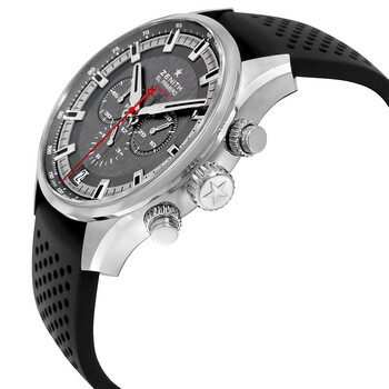 Stainless steel case with a black rubber strap. Fixed stainless steel bezel. Grey dial with luminous silver-tone hands and index hour markers. Minute markers. tachymeter markings around the outer rim. Dial Type: Analog. Luminescent hands and markers. Date display at the 6 o'clock position. Chronograph - three sub-dials displaying: 60 second, 30 minute and 12 hour. Zenith calibre El Primero 400B automatic movement, based upon Zenith El Primero 400, containing 31 Jewels, composed of 328 parts, bitting at 36000 vph, and has a power reserve of approximately 50 hours. Scratch resistant sapphire crystal. Pull / push crown. Transparent case back. Round case shape. Case size: 45 mm. Case thickness: 14.05 mm. Fold over clasp. Water resistant at 200 meters / 660 feet. Functions: chronograph, date, hour, minute, second. Luxury watch style. Watch label: Swiss Made. Item Variations: 03 2280 400/91 R576, 03-2280-400/91-R576, 03/2280/400/91/R576, 032280400/91R576. Zenith El Primero Chronograph Automatic Grey Dial Black Rubber Men's Watch 03228040091R576.