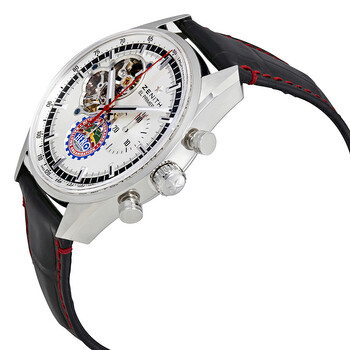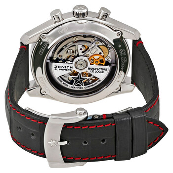 Stainless steel case with a black (alligator) leather strap with a rubber lining. Fixed stainless steel bezel. Silver cutaway dial with luminous silver-tone hands and index hour markers. Minute markers. Tachymeter markings around the outer rim. Dial Type: Analog. Luminescent hands and markers. Chronograph - three sub-dials displaying: 60 seconds, 30 minutes, and 12 hours. Zenith calibre 13 1/4 automatic movement with a 50-hour power reserve. Scratch resistant sapphire crystal. Transparent case back. Case size: 42 mm. Case thickness: 14.05 mm. Round case shape. Fold over clasp with a safety release. Water resistant at 100 meters / 330 feet. Functions: chronograph, tachymeter, hour, minute, second. Luxury watch style. Watch label: Swiss Made. Zenith El Primero Chronograph Automatic Men's Watch 03.20410.4061/07.C772.