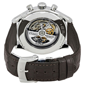 Silver-tone stainless steel case with a brown leather strap. Fixed silver-tone stainless steel bezel. Silver dial with luminous silver-tone hands and index hour markers. Minute markers. tachymeter markings around the outer rim. Dial Type: Analog. Luminescent hands and markers. Date display at the 6 o'clock position. Chronograph - three sub-dials displaying: 60 second, 30 minute and 12 hour. Zenith Calibre El Primero 400B Automatic movement, based upon Zenith El Primero 400, containing 31 Jewels, composed of 328 parts, bitting at 36000 vph, and has a power reserve of approximately 50 hours. Scratch resistant sapphire crystal. Pull / push crown. Transparent case back. Round case shape, case size: 45 mm, case thickness: 14.05 mm. Deployment clasp. Water resistant at 200 meters / 660 feet. Functions: chronograph, date, hour, minute, second. Luxury watch style. Watch label: Swiss Made. Zenith El Primero Chronograph Automatic Men's Watch 03.2520.400/69.C713.