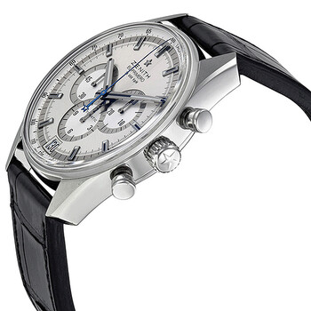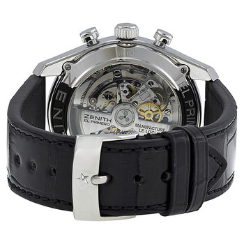 Stainless steel case with a black (alligator) leather strap. Fixed stainless steel bezel. Silver dial with luminous silver-tone hands and index hour markers. Minute markers. Tachymeter around the outer rim. Dial Type: Analog. Luminescent hands and markers. Date display appears at the 6 o'clock position. Chronograph - three sub-dials displaying: 60 second, 30 minute and 12 hour. Automatic movement with a 50 hour power reserve. Scratch resistant sapphire crystal. Skeleton case back. Case diameter: 42 mm. Case thickness: 12.75 mm. Round case shape. Tang clasp. Water resistant at 100 meters / 330 feet. Functions: chronograph, tachymeter, date, hour, minute, second. Luxury watch style. Watch label: Swiss Made. Zenith El Primero Chronograph Automatic Silver Dial Men's Watch 03.2040.400/04.C496.