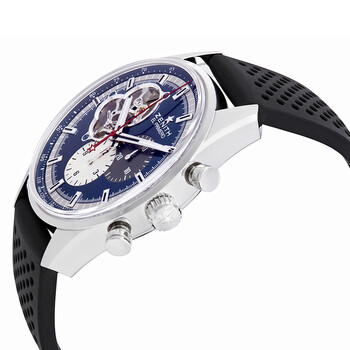 Silver-tone stainless steel case with a black rubber strap. Fixed silver-tone stainless steel bezel. Blue (open heart display) dial with luminous silver-tone hands and index hour markers. Minute markers. tachymeter markings around the outer rim. Dial Type: Analog. Luminescent hands and markers. Chronograph - two sub-dials displaying: 30 minutes, and 12 hours. Zenith Calibre El Primero 4061 Automatic movement, based upon Zenith El Primero 400, containing 31 Jewels, composed of 282 parts, bitting at 36000 vph, and has a power reserve of approximately 50 hours. Scratch resistant sapphire crystal. Pull / push crown. Transparent case back. Round case shape, case size: 42 mm, case thickness: 14.05 mm. Band width: 20 mm. Deployment clasp. Water resistant at 100 meters / 330 feet. Functions: chronograph, tachymeter, hour, minute, second. El Primero Chronomaster 1969 Series. Luxury watch style. Watch label: Swiss Made. Zenith El Primero Chronomaster 1969 Chronograph Automatic Men's Watch 03.2040.4061/52.R576.