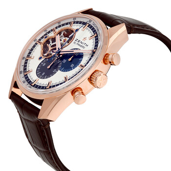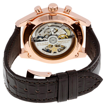 18kt rose gold case with a brown (alligator) leather strap (rubber lined). Fixed 18kt rose gold bezel. Silver (skeletonized ) dial with rose gold hands and index hour markers. Minute markers. Tachymeter around the outer rim. Dial Type: Analog. Luminescent hands and markers. Chronograph - three sub-dials displaying: 60 second, 30 minute and 12 hour. Zenith calibre El Primero 4061 automatic movement with a 50-hour power reserve. Scratch resistant sapphire crystal. Pull / push crown. Transparent exhibition case back. Round case shape. Case size: 42 mm. Case thickness: 14.05 mm. Band width: 20.3 mm. Band length: 8 inches. Tang clasp. Water resistant at 100 meters / 330 feet. Functions: chronograph, tachymeter, hour, minute, second. Luxury watch style. Watch label: Swiss Made. Zenith El Primero Chronomaster 1969 Silver Dial Brown Leather Men's Watch 18.2040.4061/69.C494.