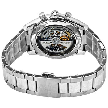 Stainless steel case with a stainless steel bracelet. Fixed stainless steel bezel. Silver (cutaway) dial with luminous silver-tone hands and index hour markers. Minute markers. Tachymeter markings around the outer rim. Dial Type: Analog. Luminescent hands and markers. Chronograph - two sub-dials displaying: 12 hour and 30 minute. Zenith calibre El Primero 4061 automatic movement, based upon Zenith El Primero 400, containing 31 Jewels, composed of 282 parts, bitting at 36000 vph, and has a power reserve of approximately 50 hours. Scratch resistant sapphire crystal. Pull / push crown. Transparent case back. Round case shape. Case size: 43 mm. Case thickness: 14.05 mm. Band width: 22 mm. Fold over clasp with a push button release. Water resistant at 100 meters / 330 feet. Functions: chronograph, column wheel, hour, minute, small second. Chronomaster El Primero Series. Dress watch style. Watch label: Swiss Made. Zenith El Primero Chronomaster 1969 Silver Dial Men's Watch 03.2040.4061/69.M2040.