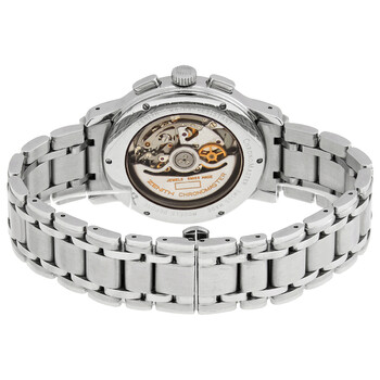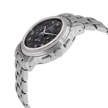 Stainless steel case with a stainless steel bracelet. Fixed stainless steel bezel. Black dial with silver-tone hands and Roman numeral hour markers. Minute markers. Tachymeter markings around the outer rim. Dial Type: Analog. Date display between the 4 and 5 o'clock positions. Day of the week window at the 10 o'clock position. Month display at the 2 o'clock position. Three sub-dials displaying: 60 second, 30 minute and 12 hour / moonphase. Automatic movement. Scratch resistant sapphire crystal. Transparent case back. Round case shape. Case size: 40 mm. Case thickness: 16.5 mm. Fold over clasp with a push button release. Water resistant at 50 meters / 165 feet. Functions: chronograph, tachymeter, month, day, date, hour, minute, second. El Primero Chronomaster Series. Luxury watch style. Watch label: Swiss Made. Zenith El Primero Chronomaster Chronograph Automatic Black Dial Watch 02.0240.410/21GB.