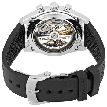 Stainless steel case with a black rubber strap. Fixed stainless steel bezel. Silver (open heart) dial with luminous silver-tone hands and index hour markers. Minute markers. Tachymeter markings around the outer rim. Dial Type: Analog. Luminescent hands and markers. Chronograph - two sub-dials displaying: 30 minute and 12 hours. Zenith calibre El Primero 4061 automatic movement, based upon Zenith El Primero 400, containing 31 Jewels, composed of 282 parts, bitting at 36000 vph, and has a power reserve of approximately 50 hours. Scratch resistant sapphire crystal. Pull / push crown. Transparent case back. Round case shape. Case size: 42 mm. Case thickness: 14.05 mm. Band width: 20 mm. Fold over clasp. Water resistant at 100 meters / 330 feet. Functions: chronograph, tachymeter, column wheel, hour, minute, small second. El Primero Chronomaster Series. Luxury watch style. Watch label: Swiss Made. Zenith El Primero Chronomaster Chronograph Automatic Silver Dial Men's Watch 03.2040.4061/01.R576.