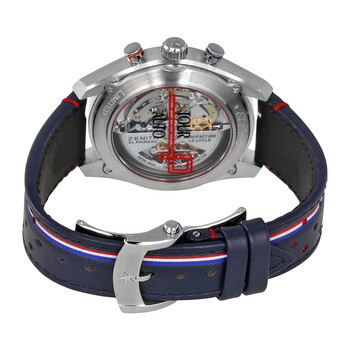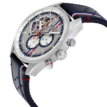 Stainless steel case with a blue calfskin leather strap. Fixed stainless steel bezel. Grey dial with a skeletal display with luminous silver-tone hands and index hour markers. Minute markers. Tachymeter markings around the outer rim. Dial Type: Analog. Luminescent hands and markers. Chronograph - three sub-dials displaying: 60 second, 30 minute and 12 hour. Automatic movement with a 50-hour power reserve. Scratch resistant sapphire crystal. Pull / push crown. Transparent case back. Case diameter: 42 mm. Case thickness: 14.05 mm. Round case shape. Deployment clasp. Water resistant at 100 meters / 330 feet. Functions: chronograph, tachymeter, hour, minute, second. Additional Info: limited edition of 500 watches.. Luxury watch style. Watch label: Swiss Made. Zenith El Primero Chronomaster Chronomaster Automatic Grey Dial Blue Leather Men's Watch 032044406101C746