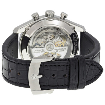Silver-tone stainless steel case with a black alligator leather strap. Fixed silver-tone stainless steel bezel. Silver (cutaway) dial with luminous silver-tone hands and index hour markers. Minute markers. Tachymeter markings around the outer rim. Dial Type: Analog. Luminescent hands and markers. Chronograph - two sub-dials displaying: 30 minute and 12 hour. Zenith Calibre El Primero 4061 Automatic movement, based upon Zenith El Primero 400, containing 31 Jewels, composed of 282 parts, bitting at 36000 vph, and has a power reserve of approximately 50 hours. Scratch resistant mineral crystal. Pull / push crown. Skeleton case back. Round case shape, case size: 42 mm, case thickness: 12.75 mm. Band width: 20.3 mm, band length: 8 inches. Deployment clasp. Water resistant at 100 meters / 330 feet. Functions: chronograph, hour, minute, second. El Primero Chronomaster Series. Luxury watch style. Watch label: Swiss Made. Zenith El Primero Chronomaster Men's Watch 03.2040.4061/69.C496.