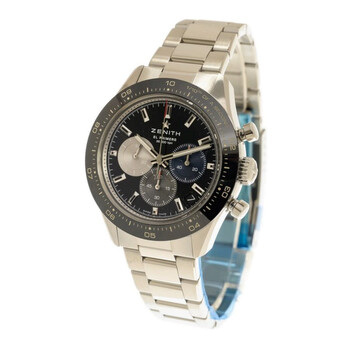 Silver-tone stainless steel case and bracelet. Fixed black ceramic bezel. Black dial with luminous silver-tone hands and index hour markers. 1/10th of a second indication. Dial Type: Analog. Luminescent hands and markers. Date display between 4 and 5 o'clock position. Chronograph - three sub-dials displaying: 60 second, 60 minute and 1/10th of a second. Zenith Calibre El Primero 3600 Automatic movement, containing 35 Jewels, composed of 311 parts, bitting at 36000 vph, and has a power reserve of approximately 60 hours. Scratch resistant sapphire crystal. Pull / push crown. Transparent case back. Round case shape, case size: 41 mm, case thickness: 13.6 mm. Folding with safety latch clasp. Water resistant at 100 meters / 330 feet. Functions: chronograph, column wheel, date, hour, minute, small second, chronometer. El Primero Chronomaster Sport Series. Luxury watch style. Watch label: Swiss Made. Zenith El Primero Chronomaster Sport Chronograph Automatic Black Dial Men's Watch 03.3100.3600/21.M3100.