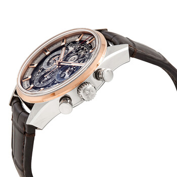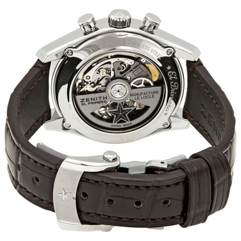 Silver-tone stainless steel case with a brown alligator leather (w. protective rubber lining) strap. Fixed rose gold 18kt. rose gold bezel. Skeletal dial with rose gold-tone hands and index hour markers. Minute markers around the outer rim. Dial Type: Analog. Luminescent hands and markers. Date display between 4 and 5 o'clock position. Chronograph - three sub-dials displaying: 60 seconds, 30 minutes, and 12 hours. Zenith Calibre El Primero 400 automatic movement with a 50-hour power reserve. Scratch resistant sapphire crystal. Pull / push crown. Transparent case back. Round case shape, case size: 38 mm, case thickness: 12.45 mm. Band width: 19 mm. Triple folding clasp. Water resistant at 100 meters / 330 feet. Functions: chronograph, column wheel, date, hour, minute, small second. Luxury watch style. Watch label: Swiss Made. Zenith El Primero Chronomaster Stainless Steel & Rose Gold Automatic Skeletal Dial Men's Watch 51.2151.400/78.C810.
