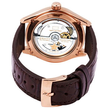 18kt rose gold case with a brown (alligator) leather (rubber backed) strap. Fixed 18kt rose gold bezel. Brown dial with luminous rose gold hands and index hour markers. Minute markers around the outer rim. Dial Type: Analog. Luminescent hands and markers. Date display at the 3 o'clock position. Zenith calibre El Primero 4650 B automatic movement with a 50-hour power reserve. Scratch resistant sapphire crystal. Screw down crown. Transparent case back. Round case shape. Case size: 40 mm. Case thickness: 11.7 mm. Tang clasp. Water resistant at 100 meters / 330 feet. Functions: date, hour, minute, second. Luxury watch style. Watch label: Swiss Made. Zenith El Primero Espada 18kt Rose Gold Automatic Chronometer Men's Watch 18.2170.4650/75.C713.