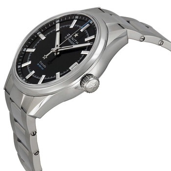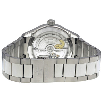 Stainless steel case with a stainless steel bracelet. Fixed stainless steel bezel. Black dial with luminous silver-tone hands and index hour markers. Minute markers around the outer rim. Dial Type: Analog. Luminescent hands and markers. Date display at the 3 o'clock position. Automatic movement with a 42 hour power reserve. Anti-reflective scratch resistant sapphire crystal. Screw down crown. Skeleton case back. Case diameter: 40 mm. Case thickness: 11.70 mm. Round case shape. Band width: 21.6 mm. Band length: 8.5 inches. Deployment clasp. Water resistant at 100 meters / 330 feet. Functions: date, hour, minute, second. Casual watch style. Watch label: Swiss Made. Zenith El Primero Espada Black Dial Stainless Steel Men's Watch 03.2170.4650/21.M2170.