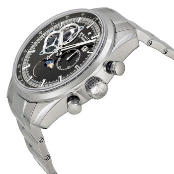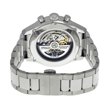 Stainless steel case with a stainless steel bracelet. Fixed stainless steel bezel. Black dial (open heart) with luminous silver-tone hands and index hour markers. Minute markers. Tachymeter around the outer rim. Dial Type: Analog. Luminescent hands and markers. Date display at the 2 o'clock position. Chronograph - three sub-dials displaying: 60 second, 30 minute and moonphase. Zenith calibre El Primero 4021 automatic movement with a 50-hour power reserve. Anti-reflective scratch resistant sapphire crystal. Pull / push crown. Transparent case back. Case diameter: 45 mm. Case thickness: 15.60 mm. Round case shape. Band width: 20.3 mm. Band length: 8 inches. Fold over clasp with a push button release. Water resistant at 165 feet / 5 atm. Functions: chronograph, date, hour, minute, second, tachymeter. Luxury watch style. Watch label: Swiss Made. Zenith El Primero Grande Date Automatic Black Dial Stainless Steel Men's Watch 032160404721M2160.