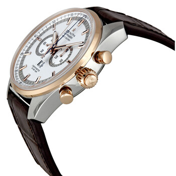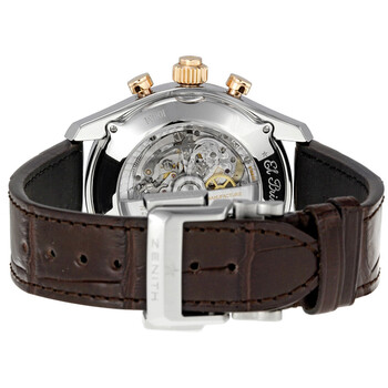 18kt rose gold case with a brown (alligator) leather strap. Fixed 18kt rose gold bezel. Silver dial with luminous rose gold hands and index hour markers. Arabic numeral minute markers (at 5 minute intervals). Minute markers around the outer rim. Dial Type: Analog. Luminescent hands and markers. Date display above the 6 o'clock position. Chronograph - two sub-dials displaying: 60 second and 30 minute. Zenith calibre El Primero 4026 automatic movement, based upon Zenith 410, containing 32 Jewels, composed of 345 parts, bitting at 36000 vph, and has a power reserve of approximately 50 hours. Scratch resistant sapphire crystal. Pull / push crown. Transparent case back. Round case shape. Case size: 44 mm. Case thickness: 16 mm. Band width: 20 mm. Triple fold over clasp with a safety release. Water resistant at 100 meters / 330 feet. Functions: column wheel, rattrapante, big date, hour, minute, small second, chronometer. El Primero Rattrapante Series. Luxury watch style. Watch label: Swiss Made. Zenith El Primero Rattrapante Chronograph Men's Watch 512050402601C713.