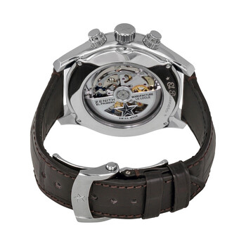 Stainless steel case with a brown (alligator) leather strap. Fixed stainless steel bezel. Silver dial with luminous silver-tone hands and index hour markers. Minute markers. Tachymeter markings around the outer rim. Dial Type: Analog. Luminescent hands and markers. Date display at the 6 o'clock position. Chronograph - three sub-dials displaying: 60 second, 30 minute and 12 hour. Zenith calibre El Primero 400B automatic movement with a 50-hour power reserve. Scratch resistant sapphire crystal. Pull / push crown. Transparent case back. Round case shape. Case size: 45 mm. Case thickness: 14.05 mm. Band width: 20 mm. Fold over clasp. Water resistant at 200 meters / 660 feet. Functions: chronograph, date, hour, minute, second. Luxury watch style. Watch label: Swiss Made. Item Variations: 03 2280 400/01 C713, 03-2280-400/01-C713, 03/2280/400/01/C713, 032280400/01C713. Zenith El Primero Sport Chronograph Automatic Silver Dial Men's Watch 03228040001C713.