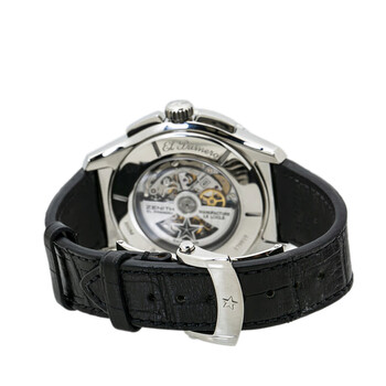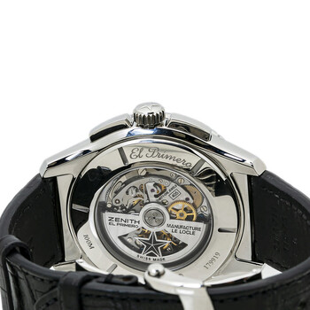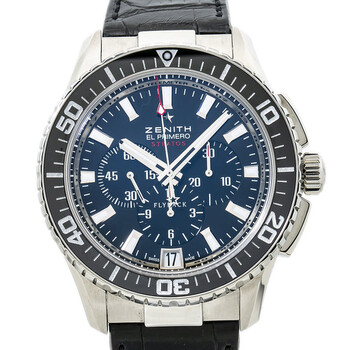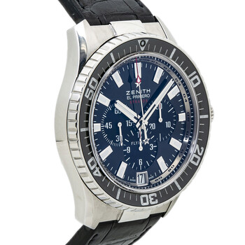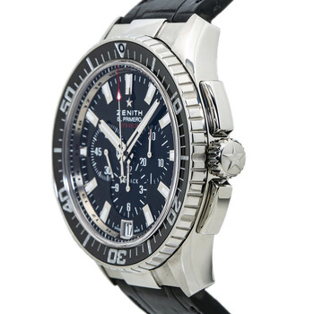 Silver-tone stainless steel case with a black leather strap. Uni-directional rotating black ceramic bezel. Black dial with silver-tone hands and index hour markers. Minute markers around the outer rim. Dial Type: Analog. Date display at the 6 o'clock position. Chronograph - three sub-dials displaying: 60 second, 30 minute and 12 hour. Automatic movement. Scratch resistant sapphire crystal. Screw down crown. Transparent case back. Round case shape, case size: 45.5 mm, case thickness: 15 mm. Band width: 23 mm, band length: 7.75 inches. Fold over clasp. Water resistant at 100 meters / 330 feet. Functions: hour, minute, date, second, chronograph. El Primero Stratos Series. Luxury watch style. Watch label: Swiss Made. Zenith El Primero Stratos Chronograph Automatic Black Dial Men's Watch 03.2060.405.