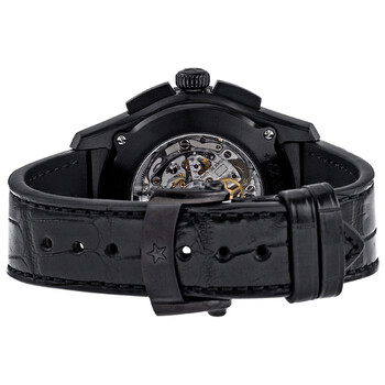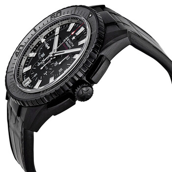 Black alchron alloy case with a black alligator leather strap. Uni-directional rotating black bezel. Black dial with silver-tone hands and index hour markers. Minute markers around the outer rim. Dial Type: Analog. Luminescent hands and markers. Date display at the 6 o'clock position. Chronograph - three sub-dials displaying: 60 second, 30 minute and 12 hour. Zenith Calibre El Primero 405B Automatic movement, based upon Zenith El Primero 400, containing 31 Jewels, composed of 331 parts, bitting at 36000 vph, and has a power reserve of approximately 50 hours. Scratch resistant sapphire crystal. Skeleton case back. Round case shape, case size: 45.5 mm, case thickness: 14.8 mm. Deployment clasp. Water resistant at 100 meters / 330 feet. Functions: chronograph, flyback, date, hour, minute, second. El Primero Stratos Flyback Series. Casual watch style. Watch label: Swiss Made. Item Variations: 24 2060 405/21 C714, 24-2060-405/21-C714, 24/2060/405/21/C714, 242060405/21C714. Zenith El Primero Stratos Fly Back Black Dial Alligator Leather Men's Watch 24.2060.405/21.C714.