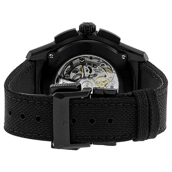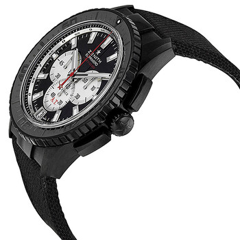 Black alchron case with a black fabric bracelet. Uni-directional rotating black ceramic bezel. Black dial with silver-tone hands and stick hour markers. Minute markers around the outer rim. Dial Type: Analog. Luminescent hands and markers. Date display appears at the 6 o'clock position. Chronograph - three silver sub-dials displaying: 60 second, 60 minute and 1/10th of a second. Zenith Calibre El Primero 4057B Automatic movement, bitting at 36000 vph, and has a power reserve of approximately 50 hours. Scratch resistant sapphire crystal. Screw down crown. Skeleton case back. Case diameter: 45.5 mm. Round case shape. Deployment with push button clasp. Water resistant at 100 meters / 330 feet. Functions: chronograph, date, hour, minute, second. Additional Info: "flyback" function, which allows instant restarting of the chronograph with a single push of the button instead of the need to stop, reset & then rest. Luxury watch style. Watch label: Swiss Made. Zenith EL Primero Stratos Flyback Automatic Chronograph Black Alchron Men's Watch 24.2061.4057/67.C707.