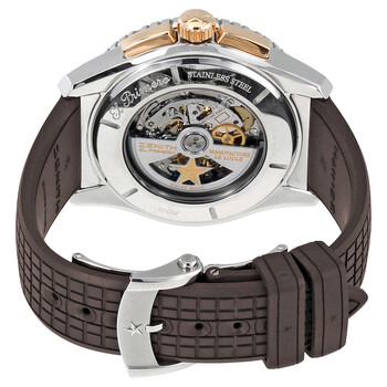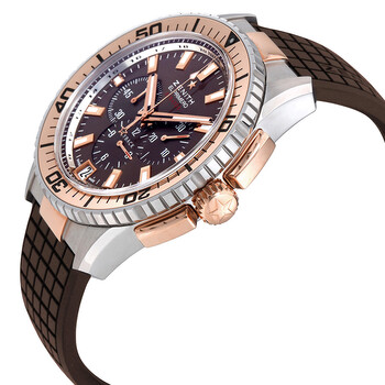 Stainless steel and 18kt rose gold case with a brown rubber strap. Uni-directional rotating bezel. Brown dial with luminous hands and index hour markers. Telemeter scale appears around the outer rim. Dial Type: Analog. Date display at the 6 o'clock position. Chronograph - three sub-dials displaying: 60 second, 30 minute and 12 hour. Automatic movement. Scratch resistant sapphire crystal. Case diameter: 45.5 mm. Case thickness: 14.8 mm. Round case shape. Deployment clasp. Water resistant at 100 meters / 330 feet. Functions: chronograph, date, hour, minute, second. Luxury watch style. Watch label: Swiss Made. Zenith El Primero Stratos Flyback Brown Dial Rubber Men's Watch 51206140575R516.
