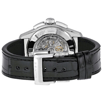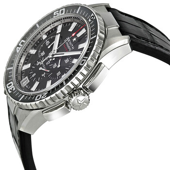 Stainless steel case with a black croco-embossed leather strap. Uni-directional rotating black ion-plated bezel. Black dial with luminous hands and index hour markers. Minute markers. Tachymeter around the outer rim. Dial Type: Analog. Luminescent hands and markers. Date display at the 6 o'clock position. Chronograph - three sub-dials displaying: 60 second, 30 minute and 12 hour. Automatic movement. Scratch resistant sapphire crystal. Screw down crown. Transparent case back. Case diameter: 45.5 mm. Case thickness: 14.8 mm. Round case shape. Band width: 18 mm / 23 mm. Band length: 8.75 inches. Deployment clasp with push button release. Water resistant at 100 meters / 330 feet. Functions: chronograph, tachymeter, date, hour, minute, second. Casual watch style. Zenith El Primero Stratos Flyback Men's Watch 03206040521C714.