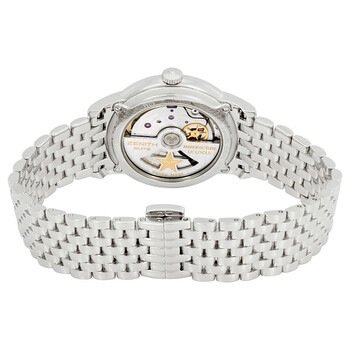 Silver-tone stainless steel case with a silver-tone stainless steel bracelet. Fixed silver-tone stainless steel bezel. Silver-tone dial with silver-tone leaf-style shape hands and Roman numeral hour markers. Dial Type: Analog. Two - small second and moon phase subdials. Zenith Calibre Elite 692 Automatic movement, based upon Zenith Elite 670, containing 27 Jewels, bitting at 28800 vph, and has a power reserve of approximately 50 hours. Scratch resistant sapphire crystal. Pull / push crown. Transparent case back. Round case shape, case size: 33 mm, case thickness: 9.25 mm. Fold over with push button release clasp. Water resistant at 50 meters / 165 feet. Functions: moon phase, hour, minute, small second. Luxury watch style. Watch label: Swiss Made. Zenith Elite Automatic Moonphase Ladies Watch 03.2330.692/02.M2330.