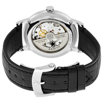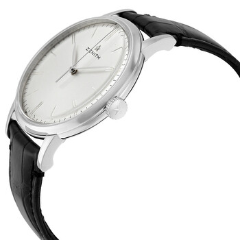 Stainless steel case with a black (alligator) leather strap. Fixed stainless steel bezel. Silver dial with silver-tone hands and index hour markers. Minute markers around the outer rim. Dial Type: Analog. Zenith calibre Elite 6150 automatic movement with about 100 hours of power reserve. Scratch resistant sapphire crystal. Pull / push crown. Transparent case back. Case size: 42 mm. Case thickness: 9.45 mm. Round case shape. Band width: 19 mm. Band length: 8 inches. Tang clasp. Water resistant at 50 meters / 165 feet. Functions: hour, minute, second. Luxury watch style. Watch label: Swiss Made. Zenith Elite Automatic Men's Watch 03.2270.6150/01.C493.