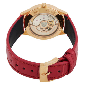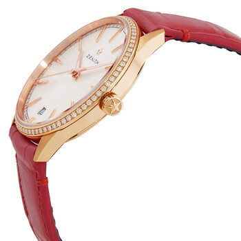 18kt rose gold case with a burgundy alligator leather strap. Fixed bezel with diamond set. Silver sunray dial with rose gold hands and index hour markers. Dial Type: Analog. Date display at the 6 o'clock position. Zenith Calibre Elite automatic movement with a 50-hour power reserve. Scratch resistant sapphire crystal. Pull / push crown. Round case shape, case size: 36 mm. Water resistant at 50 meters / 165 feet. Functions: date, hour, minute, second. Elite Classic Series. Luxury watch style. Watch label: Swiss Made. Zenith Elite Classic Automatic Diamond Ladies Watch 22.3200.670/01.C831.