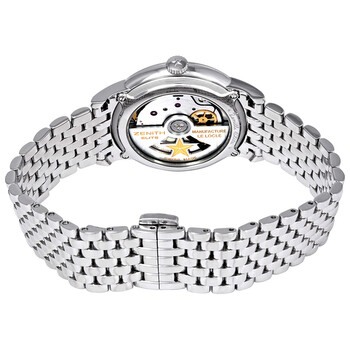 Stainless steel case with a stainless steel bracelet. Fixed stainless steel bezel. Silver dial with silver-tone - rhodium-plated leaf-style hands and Roman numeral hour markers. Dial Type: Analog. Zenith caliber Elite 679 automatic movement, based upon Zenith 680, containing 26 Jewels, bitting at 28800 vph, and has a power reserve of approximately 55 hours. Scratch resistant sapphire crystal. Pull / push crown. Transparent case back. Round case shape. Case size: 33 mm. Case thickness: 9.25 mm. Band width: 17 mm. Triple fold over clasp. Water resistant at 50 meters / 165 feet. Functions: hour, minute, second. Luxury watch style. Watch label: Swiss Made. Zenith Elite Lady Automatic Silver Dial Ladies Watch 03.2330.679/11.M2330.