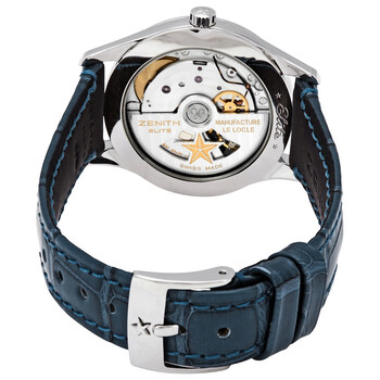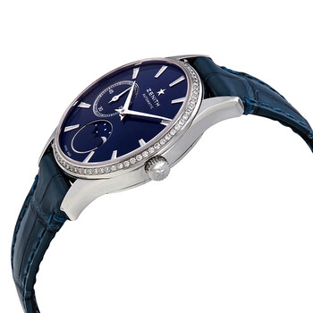 Stainless steel case with a blue (alligator) leather strap. Fixed stainless steel bezel set with diamonds. Blue dial with silver-tone dauphine-style hands and index hour markers. Dial Type: Analog. Two sub-dials displaying: 60 second and moonphase. Zenith calibre Elite 692 automatic movement, based upon Zenith Elite 670, containing 27 Jewels, bitting at 28800 vph, and has a power reserve of approximately 50 hours. Scratch resistant sapphire crystal. Transparent case back. Round case shape. Case size: 33 mm. Case thickness: 7.6 mm. Tang clasp. Water resistant at 30 meters / 100 feet. Functions: moon phase, hour, minute, small second. Elite Ultra Thin Lady Moonphase Series. Luxury watch style. Watch label: Swiss Made. Item Variations: 16 2310 692/51 C705, 16-2310-692/51-C705, 16/2310/692/51/C705, 162310692/51C705. Zenith Elite Ultra Thin Lady Automatic Moonphase Blue Dial Diamond Watch 16.2310.692/51.C705.