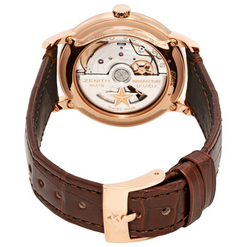 18kt rose gold case with a brown (alligator) leather (rubber backed) strap. Fixed 18kt rose gold bezel. White mother of pearl dial with rose gold-tone hands and index hour markers. Dial Type: Analog. Two sub-dials displaying: small second and moon phase. Zenith calibre Elite 692 automatic movement with a 50-hour power reserve. Scratch resistant sapphire crystal. Pull / push crown. Transparent case back. Round case shape. Case size: 36 mm. Tang clasp. Water resistant at 30 meters / 100 feet. Functions: moon phase, hour, minute, small second. Luxury watch style. Watch label: Swiss Made. Zenith Elite Ultra Thin Lady Moonphase Watch 18.2320.692/80.C713.