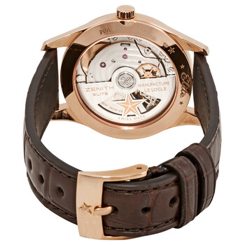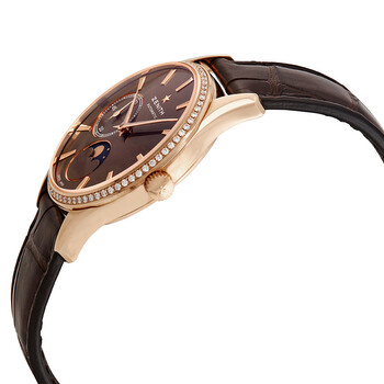18kt rose gold case with a brown (alligator) leather (rubber backed) strap. Fixed 18kt rose gold set with diamonds bezel. Brown dial with rose gold-tone dauphine-style shape hands and index hour markers. Dial Type: Analog. Two - moonphase and small second subdials. Zenith Calibre Elite 692 Automatic movement, based upon Zenith Elite 670, containing 27 Jewels, bitting at 28800 vph, and has a power reserve of approximately 50 hours. Anti-reflective scratch resistant sapphire crystal. Pull / push crown. Transparent case back. Round case shape, case size: 33 mm, case thickness: 7.6 mm. Tang clasp. Water resistant at 30 meters / 100 feet. Functions: hour, minute, small second, moonphases. Additional Info: suitable for splashing, light rain; unsuitable for swimming or diving. Luxury watch style. Watch label: Swiss Made. Item Variations: 22 2310 692/75 C709, 22-2310-692/75-C709, 22/2310/692/75/C709, 222310692/75C709. Zenith Heritage 18kt Rose Gold Automatic Brown Moonphases Dial Ladies Watch 22.2310.692/75.C709.