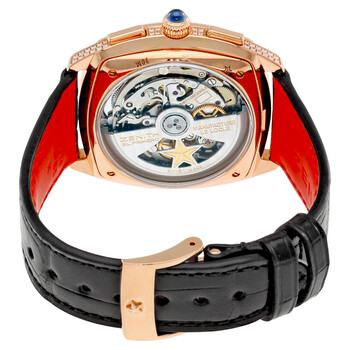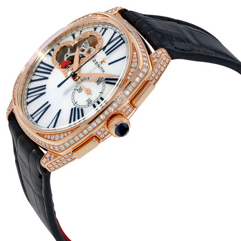18kt rose gold case set with diamond with a black leather and rubber strap. Fixed rose gold bezel set with diamond. White mother of pearl dial with rose gold and blue-tone hands and Roman numeral hour markers. Minute markers around the outer rim. Dial Type: Analog. One sub-dial displaying small seconds at the 3 o'clock position. Automatic movement with a 50-hour power reserve. El Primero 4062 engine. Anti-reflective scratch resistant sapphire crystal. Transparent sapphire glass case back. Case dimension: 37 mm x 37 mm. Case thickness: 12.70 mm. Square case shape. Triple folding clasp. Water resistant at 30 meters / 100 feet. Functions: chronograph, hour, minute, second. Additional Info: heart-shape diamond cut-out on the dial. Luxury watch style. Watch label: Swiss Made. Zenith Heritage Automatic Chronograph Ladies Watch 22.1927.4062/80.C714.