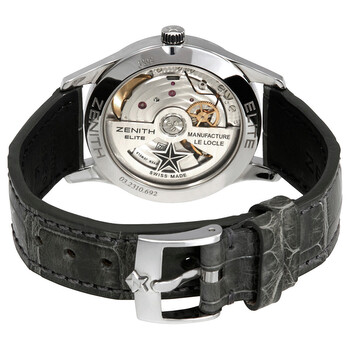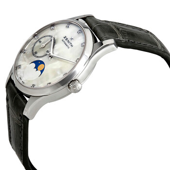 Silver-tone stainless steel case with a olive green alligator leather strap. Fixed silver-tone stainless steel bezel. Mother of pearl dial with silver-tone hands and diamond hour markers. Dial Type: Analog. Small seconds and moonphase sub-dial subdials. Zenith Calibre Elite 692 automatic movement with a 50-hour power reserve. Scratch resistant sapphire crystal. Transparent case back. Case size: 33 mm. Round case shape. Tang clasp. Water resistant at 30 meters / 100 feet. Functions: hour, minute, second, moon phase. Luxury watch style. Watch label: Swiss Made. Item Variations: 03 2310 692/81 C706, 03-2310-692/81-C706, 03/2310/692/81/C706, 032310692/81C706. Zenith Heritage Elite Ultra Thin Lady Moonphase Diamond Automatic Watch 03.2310.692/81.C706.
