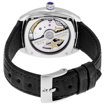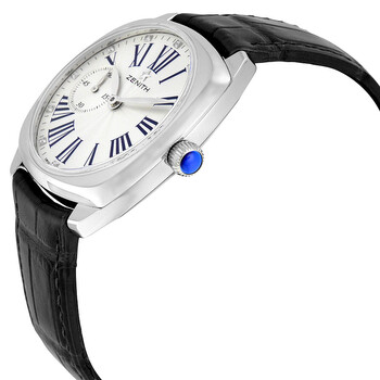 Stainless steel case with a grey alligator strap. Fixed stainless steel bezel. Silver dial with silver-tone hands and Roman numeral / diamond hour markers. Minute markers around the outer rim. Dial Type: Analog. Small seconds sub-dial at the 9 o'clock position. Automatic movement with a 50-hour of power reserve. Scratch resistant sapphire crystal. Pull / push crown. Transparent case back. Case size: 33 mm. Case thickness: 9.45 mm. Cushion case shape. Tang clasp. Water resistant at 30 meters / 100 feet. Functions: hour, minute, second. Luxury watch style. Watch label: Swiss Made. Item Variations: 03 1970 681/01 C733, 03-1970-681/01-C733, 03/1970/681/01/C733, 031970681/01C733. Zenith Heritage Star Automatic Ladies Watch 03197068101C733.