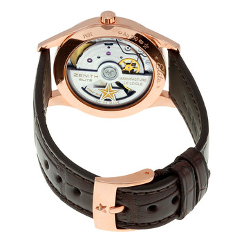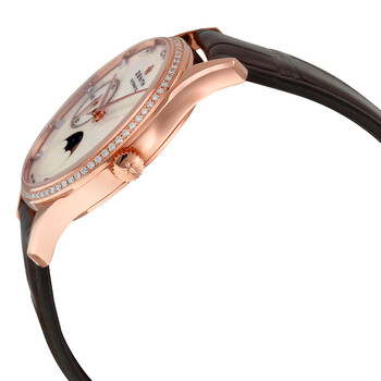 18kt rose gold case with a brown alligator leather strap. Fixed 18kt rose gold set with diamonds bezel. White mother of pearl dial with rose gold-tone dauphine-style shape hands and diamond hour markers. Dial Type: Analog. Two - seconds and moonphase subdials. Zenith Calibre Elite 692 Automatic movement, based upon Zenith Elite 670, containing 27 Jewels, bitting at 28800 vph, and has a power reserve of approximately 50 hours. Anti-reflective scratch resistant sapphire crystal. Pull / push crown. Transparent case back. Round case shape. Case size: 33 mm. Band width: 17.8 mm, band length: 7 inches. Tang clasp. Water resistant at 30 meters / 100 feet. Functions: hour, minute, small second, moonphases. Luxury watch style. Watch label: Swiss Made. Item Variations: 22 2310 692/81 C709, 22-2310-692/81-C709, 22/2310/692/81/C709, 222310692/81C709. Zenith Heritage Ultra Thin Moonphase 18kt Rose Gold Automatic Mother of Pearl Dial Ladies Watch 22.2310.692/81.C709.