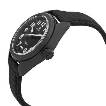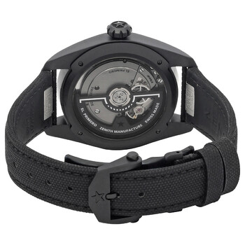 Black ceramic case with a black rubber strap. Ceramic black bezel with crystal set. Black dial with luminous hands and Arabic numeral hour markers. Minute scale around the inner rim. Dial Type: Analog. Luminescent hands and markers. Date display at the 6 o'clock position. Zenith Calibre El Primero 3620 automatic movement with a 60-hour power reserve. Scratch resistant sapphire crystal. Screw down crown. Transparent see through case back. Round case shape, case size: 40 mm. Buckle clasp. Water resistant at 100 meters / 330 feet. Functions: date, hour, minute, second. Pilot Series. Dress watch style. Watch label: Swiss Made. Zenith Pilot Automatic Crystal Black Dial Men's Watch 49.4000.3620/21.I001.