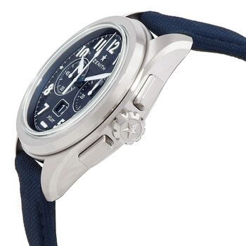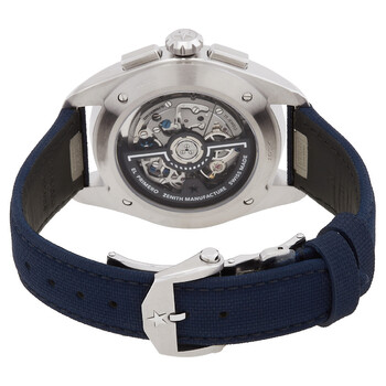 Silver-tone stainless steel case with a blue cordura-effect rubber strap. Fixed silver-tone stainless steel bezel. Blue dial with silver-tone hands and Arabic numeral hour markers. Minute markers around the outer rim. Luminescent hands and markers. Date display at the 6 o'clock position. Chronograph - two sub-dials displaying: 60 second and 30 minute. El Primero 3652 automatic movement. Scratch resistant sapphire crystal. Screw down crown. Transparent see through case back. Round case shape, case size: 42.5 mm. Tang clasp. Water resistant at 100 meters / 330 feet. Functions: chronograph, date, hour, minute, second. Pilot Series. Sport watch style. Watch label: Swiss Made. Zenith Pilot Big Date Flyback Automatic Blue Dial Men's Watch 03.4000.3652/51.I003.