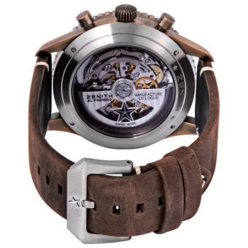 Bronze case with a brown (oily nubuck) leather (rubber backed) strap. Fixed bronze bezel with an inlaid black ring. Bronze grained dial with luminous bronze-tone sword-shaped hands and Arabic numeral hour markers. Minute markers around the outer rim and on bezel. Dial Type: Analog. Luminescent hands and markers. Chronograph - two sub-dials displaying: 60 second and 30 minute. Zenith calibre El Primero 405B automatic movement, based upon Zenith El Primero 400, containing 31 Jewels, composed of 331 parts, bitting at 36000 vph, and has a power reserve of approximately 50 hours. Scratch resistant sapphire crystal. Pull / push crown. Transparent case back. Round case shape. Case size: 43 mm. Case thickness: 12.85 mm. Strap width: 20 mm. Tang clasp. Water resistant at 100 meters / 330 feet. Functions: chronograph, hour, minute, second. Pilot watch style. Watch label: Swiss Made. Zenith Pilot Cronometro Tipo CP-2 Flyback Chronograph Automatic Bronze Grained Dial Men's Watch 29.2240.405/18.C801.