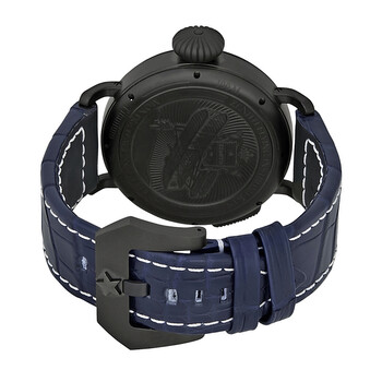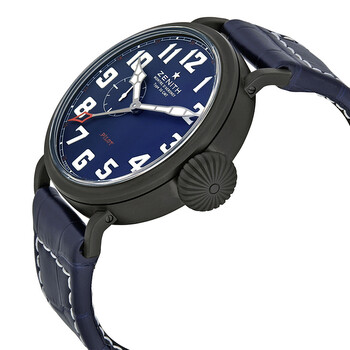 Black dlc coated titanium case with a blue leather strap. Fixed bezel. Blue dial with silver-tone hands and Arabic numeral hour markers. Minute markers around the outer rim. Dial Type: Analog. Luminescent hands and markers. One- small seconds subdials. Zenith Calibre 693 automatic movement with a 50-hour power reserve. Scratch resistant sapphire crystal. Case size: 48 mm. Case thickness: 15.80 mm. Round case shape. Water resistant at 100 meters / 330 feet. Functions: GMT, second time zone, hour, minute, small second. Additional Info: limited edition of 50 pieces. Dress watch style. Watch label: Swiss Made. Zenith Pilot Montre dAeronef Type 20 Automatic Men's GMT Watch 96.2436.693/51.C779.