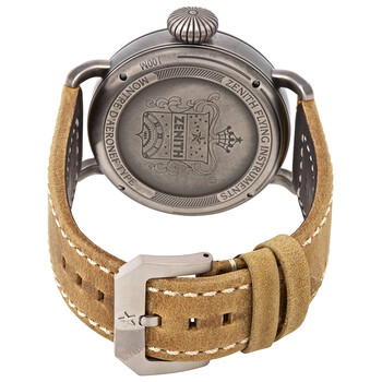 Aged stainless steel case with a mustard (nubuck) leather strap (with a protective rubber backing) Fixed aged stainless steel bezel. Grey grained dial with luminous ruthenium-plated cathedral-style hands and Arabic numeral hour markers. Minute markers around the outer rim. Dial Type: Analog. Luminescent hands and markers. Zenith caliber Elite 679 automatic movement, based upon Zenith 680, containing 26 Jewels, bitting at 28800 vph, and has a power reserve of approximately 55 hours. Scratch resistant sapphire crystal. Pull / push crown. Solid case back. Round case shape. Case size: 40 mm. Case thickness: 12.95 mm. Band width: 20 mm. Tang clasp. Water resistant at 100 meters / 330 feet. Functions: hour, minute, second. Pilot watch style. Watch label: Swiss Made. Zenith Pilot Type 20 Automatic Grey Grained Dial Men's Watch 11.1940.6799/1c807.